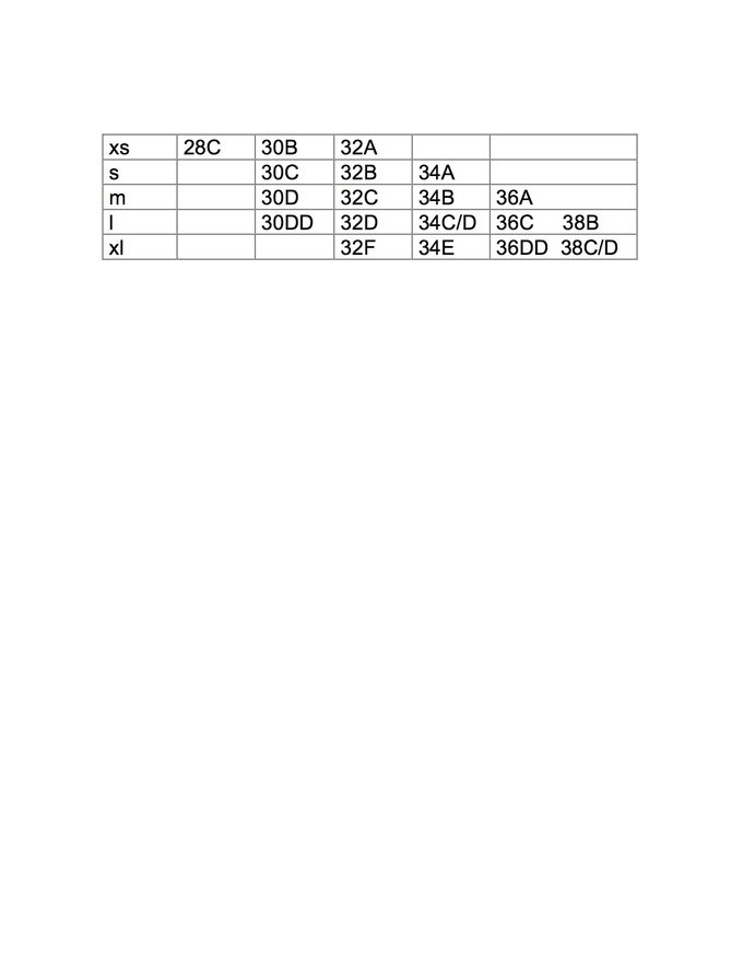 XS: 28AA-C, 30AA-B, 32AA-A, 34AA, 32B-C